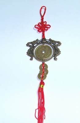 Clopotel Feng Shui cu 2 dragoni, moneda mare